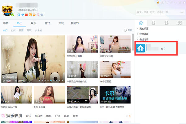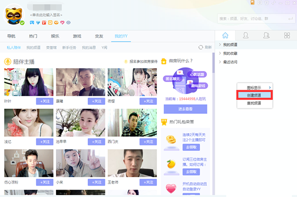 3、登陆YY语音后,在右边的频道右击,可创建自己的频道