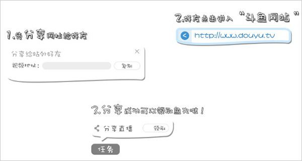 4、分享:1、先分享视频地址给好友,2、好友点击进入“斗鱼网站”3、分享成功可以领取鱼丸啦!您每邀请一个好友进入就可以获得10个鱼丸哦(每个好友只记一次哦)